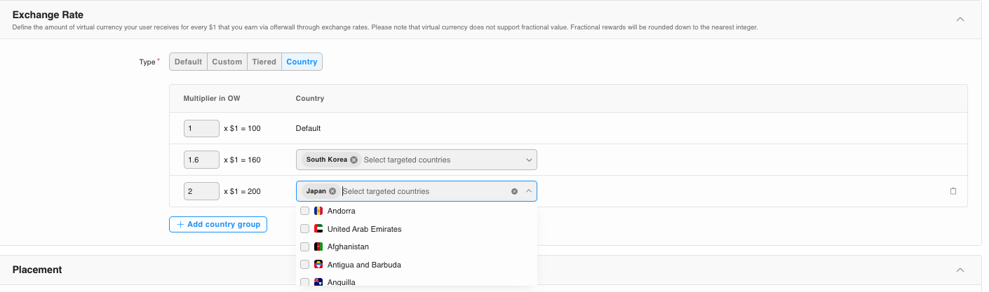 Use the country setting to assign different exchange rates by region. This can help to account for different levels of purchasing power based on a user’s country and optimize Offerwall performance globally.Country-based exchange rate use cases