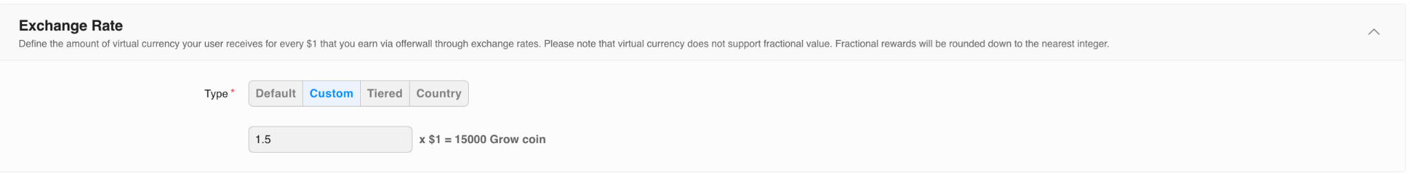This is the standard exchange rate applied when no custom settings are in place. For example, if the default rate is $1 = 100 coins, users will receive 100 coins for each $1 you earn. To modify this behavior, consider using Custom or Tiered rates.Custom exchange rates