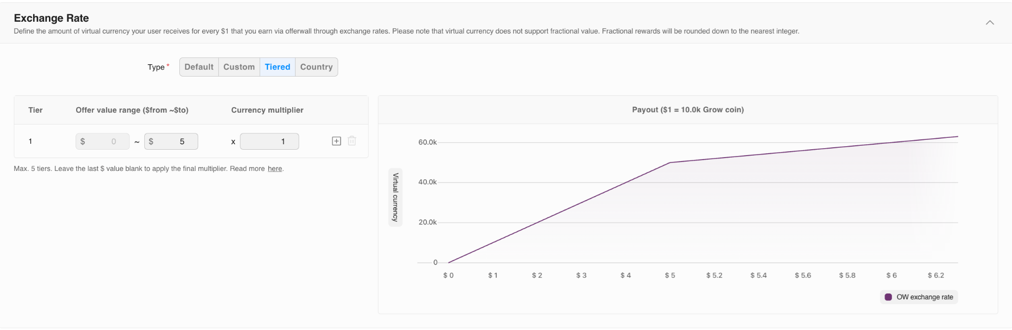 In the first tier, the offer value range is from $0 to $5 with a currency multiplier of .