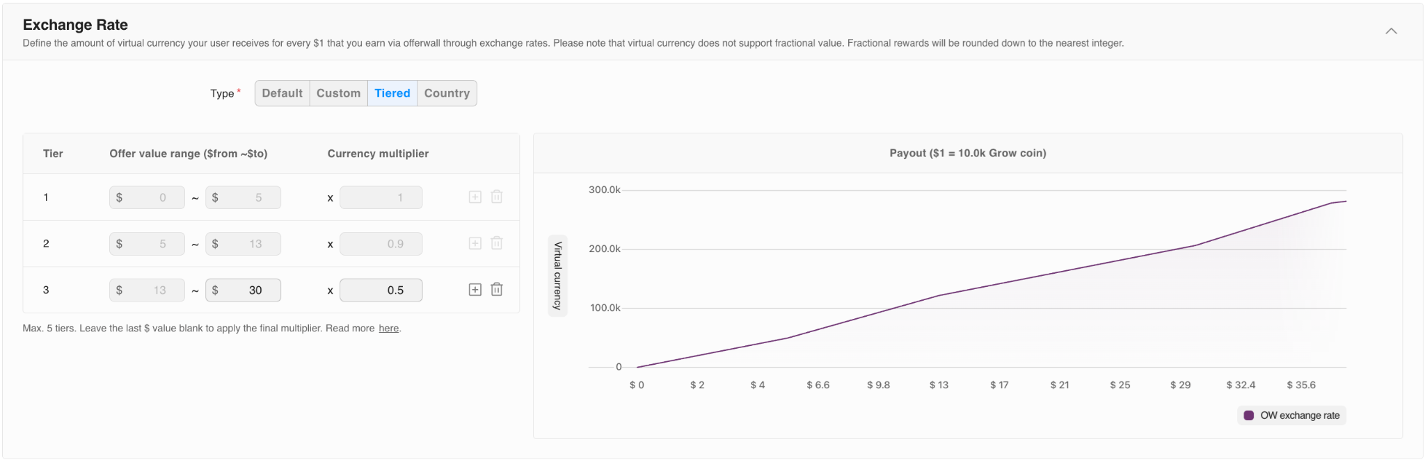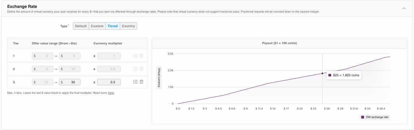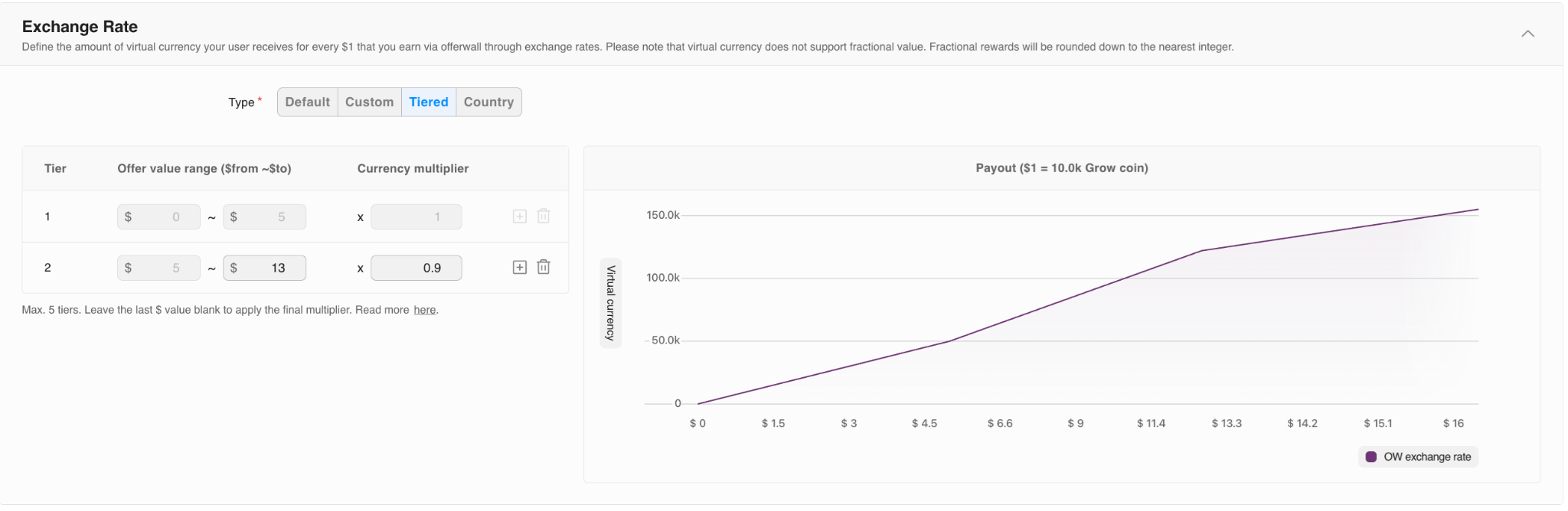 The tiered setting gives you granular control by assigning different multipliers based on offer value. This tool helps you align the value of your Offerwall currency with your in-app purchase pricing, making offers more appealing to users without risking Offerwall engagement with IAP cannibalization. This structure can help you to balance Offerwall incentives more closely with your in-app purchase pricing and user value tiers.Tiered exchange rate use cases