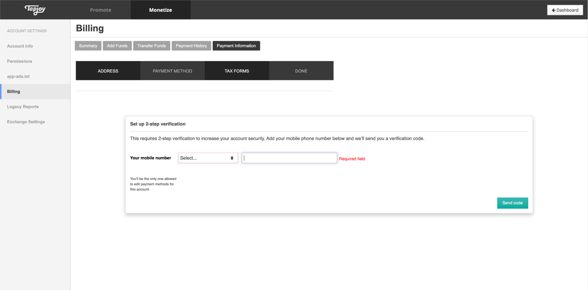Enable two‑step verification in the Tapjoy User Acquisition dashboard to receive payments.
