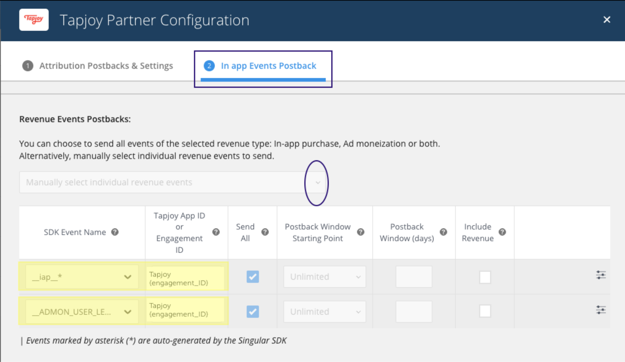 In app Event Postback.__ IAP__ - Add the corresponding Tapjoy Engagement ID in the column.