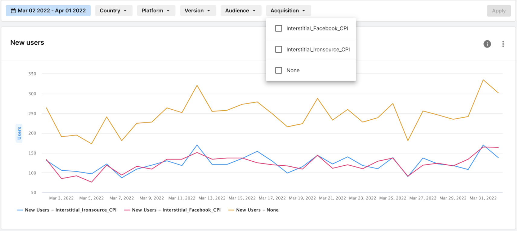 用户获取后台会显示按广告网络提供商细分的数据。请使用顶部的用户获取过滤器来选择所需的提供商。这样将显示一个图表,您可以按日期范围、国家/地区、平台、设备版本和受众进一步过滤。