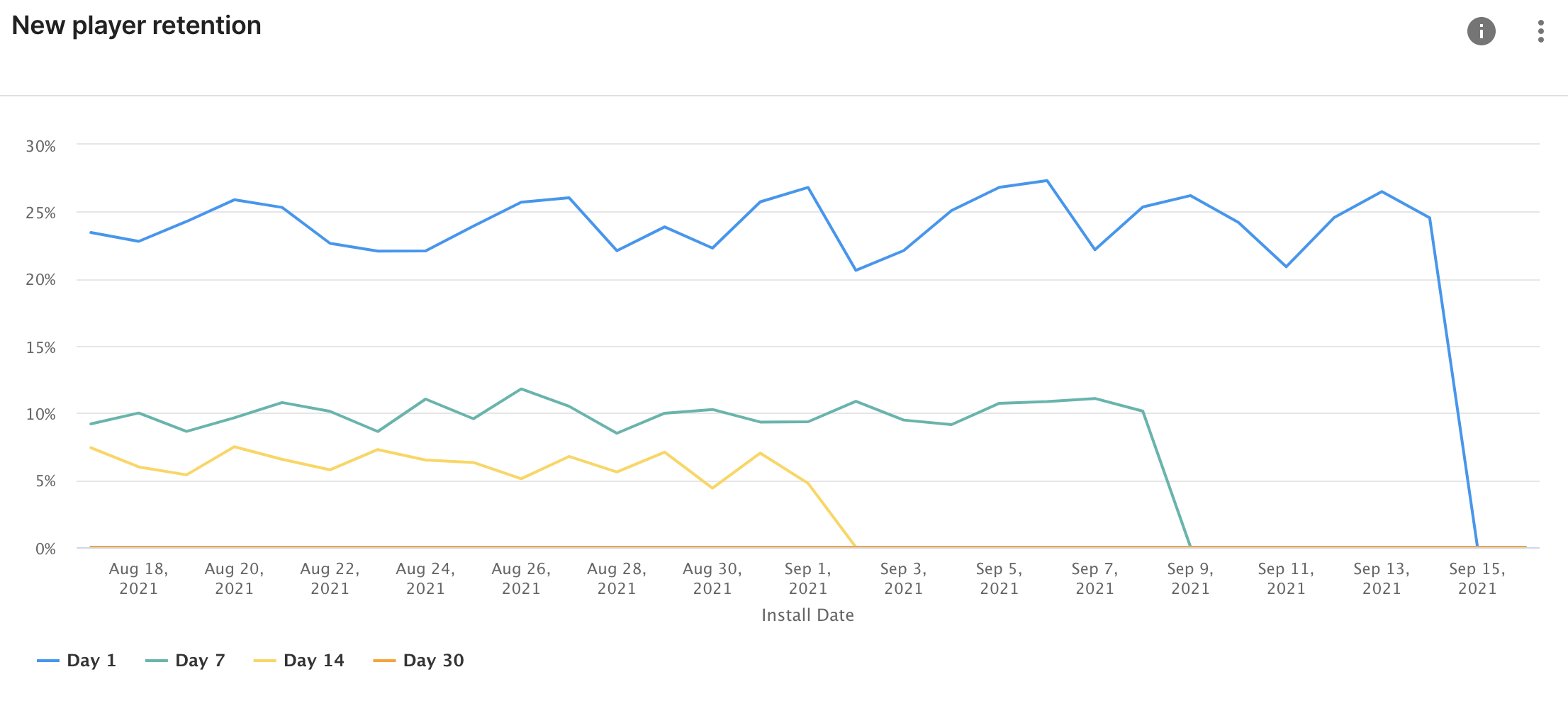 留存率后台显示哪些玩家在安装游戏后仍在玩该游戏。根据玩家停止玩游戏所需的天数来衡量留存率有助于了解游戏的表现。渐进的曲线表示留存率较高,而急剧下降的曲线表明玩家在游戏中的某个点停止玩游戏。 发送事件的玩家被视为活跃玩家。