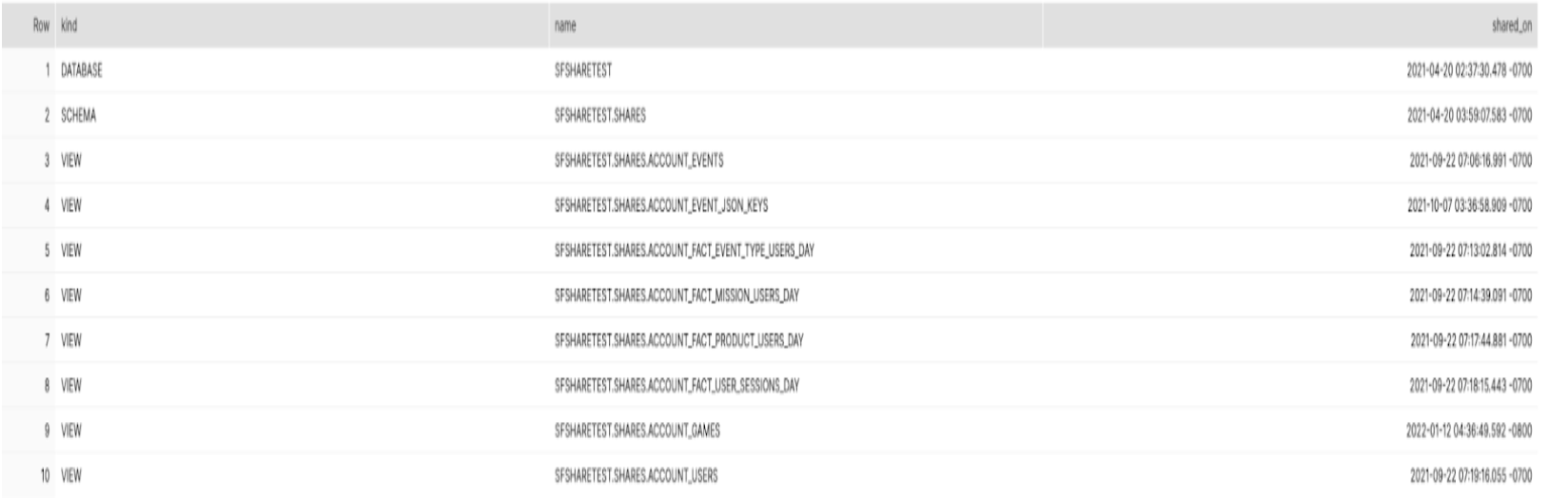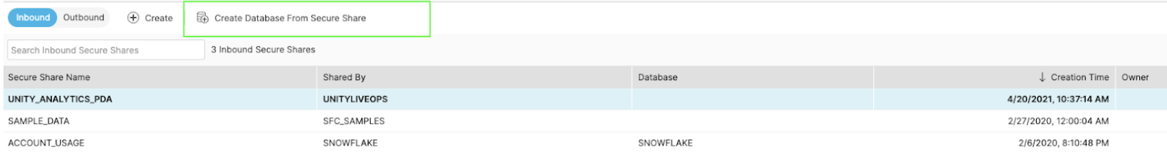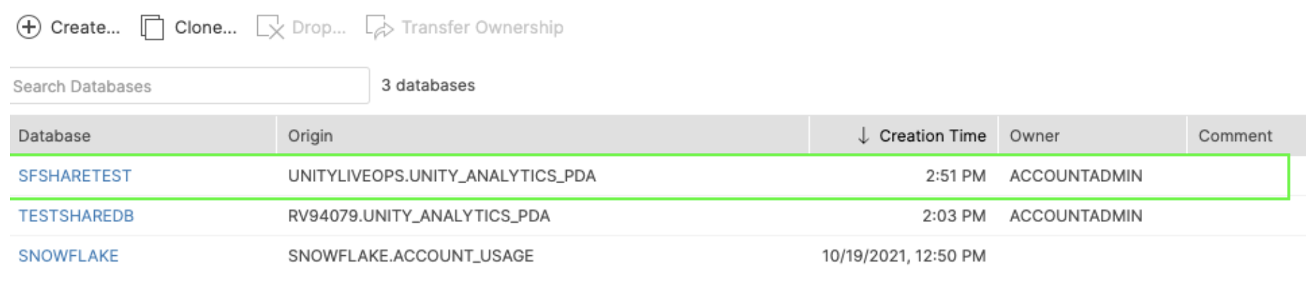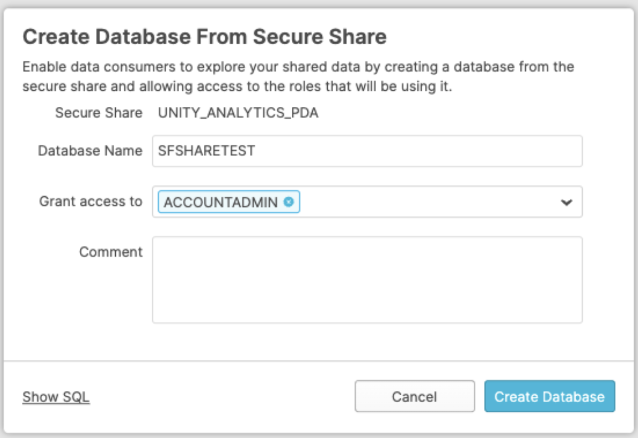 CREATE DATABASE "SFSHARETEST" FROM SHARE UNITYLIVEOPS."UNITY_ANALYTICS_PDA"; GRANT IMPORTED PRIVILEGES ON DATABASE "SFSHARETEST" TO ROLE "ACCOUNTADMIN";