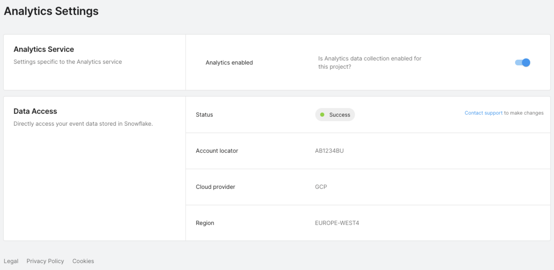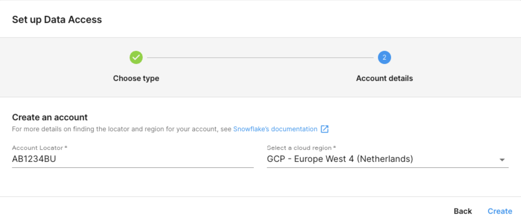 您的 Snowflake 帐户的云服务提供商和区域(必须是 GCP EU-WEST4 或 GCP US-CENTRAL1)