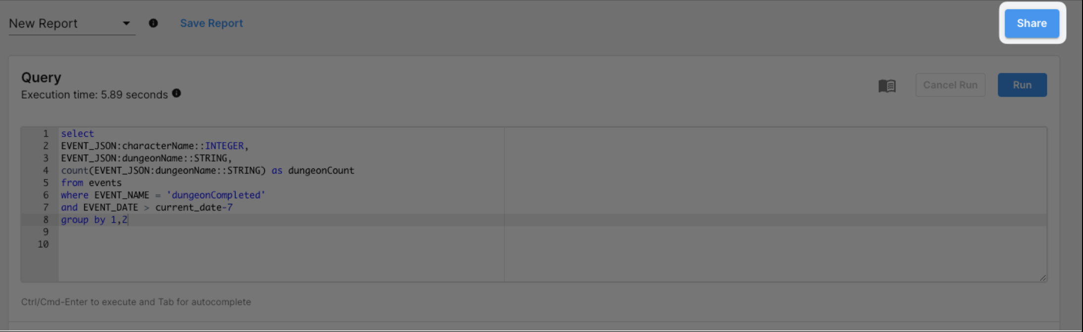 请参考以下示例以清楚地了解每个地牢使用角色的次数。这将有助于更好地平衡角色和地牢。注意: 注释selectEVENT_JSON:characterName::INTEGER,EVENT_JSON:dungeonName::STRING,count(EVENT_JSON:dungeonName::STRING) as dungeonCountfrom eventswhere EVENT_NAME = 'dungeonCompleted'and EVENT_DATE > current_date-7group by 1,2