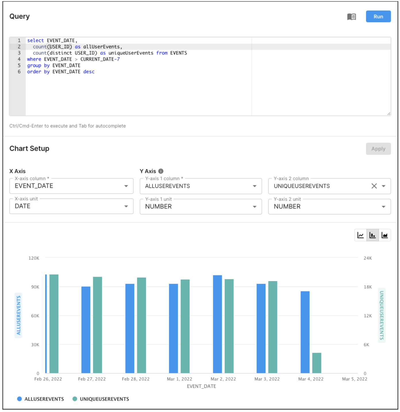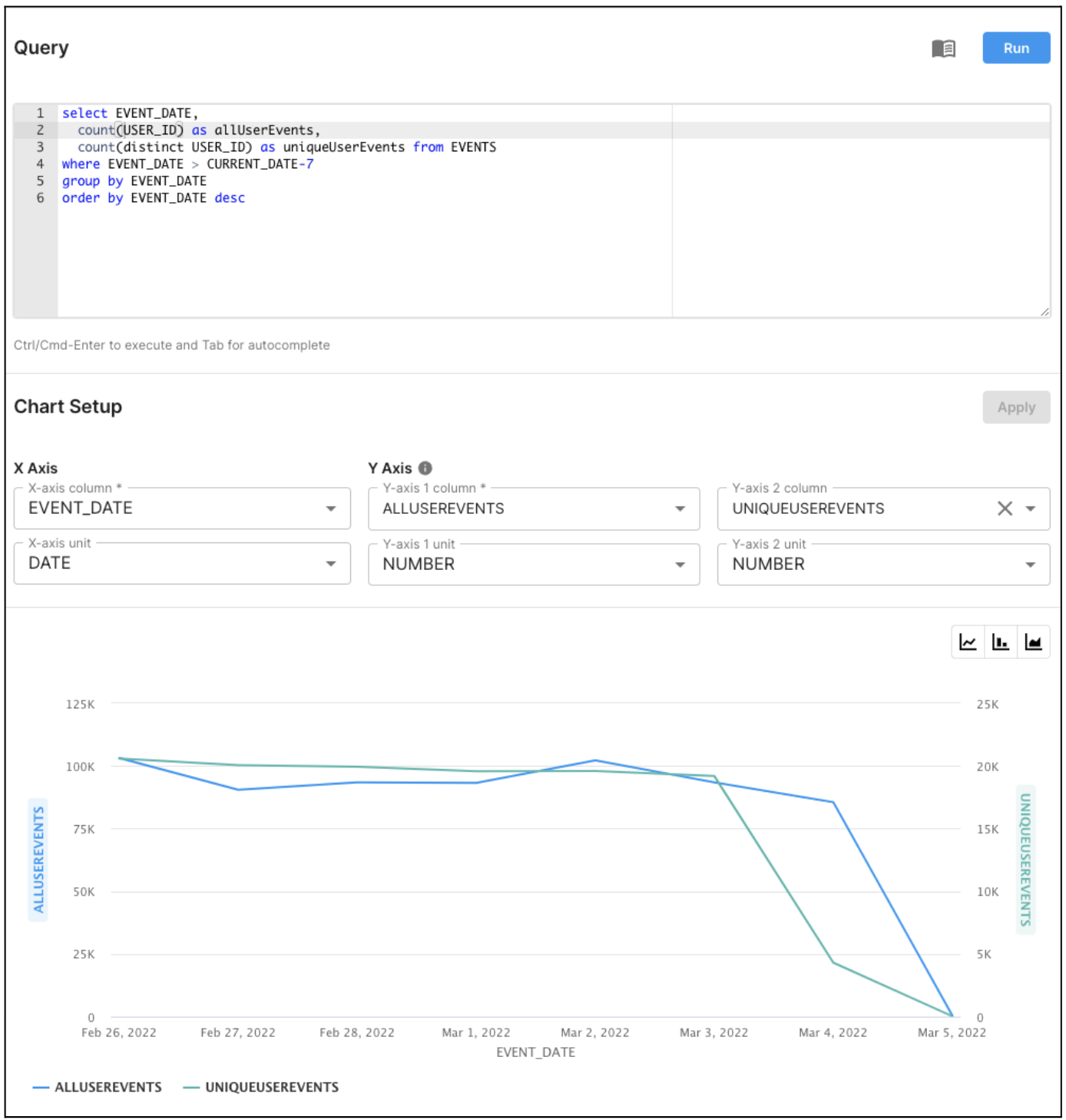 select EVENT_DATE, count(distinct USER_ID) from EVENTS where EVENT_DATE > CURRENT_DATE-7 group by EVENT_DATE order by EVENT_DATE desc