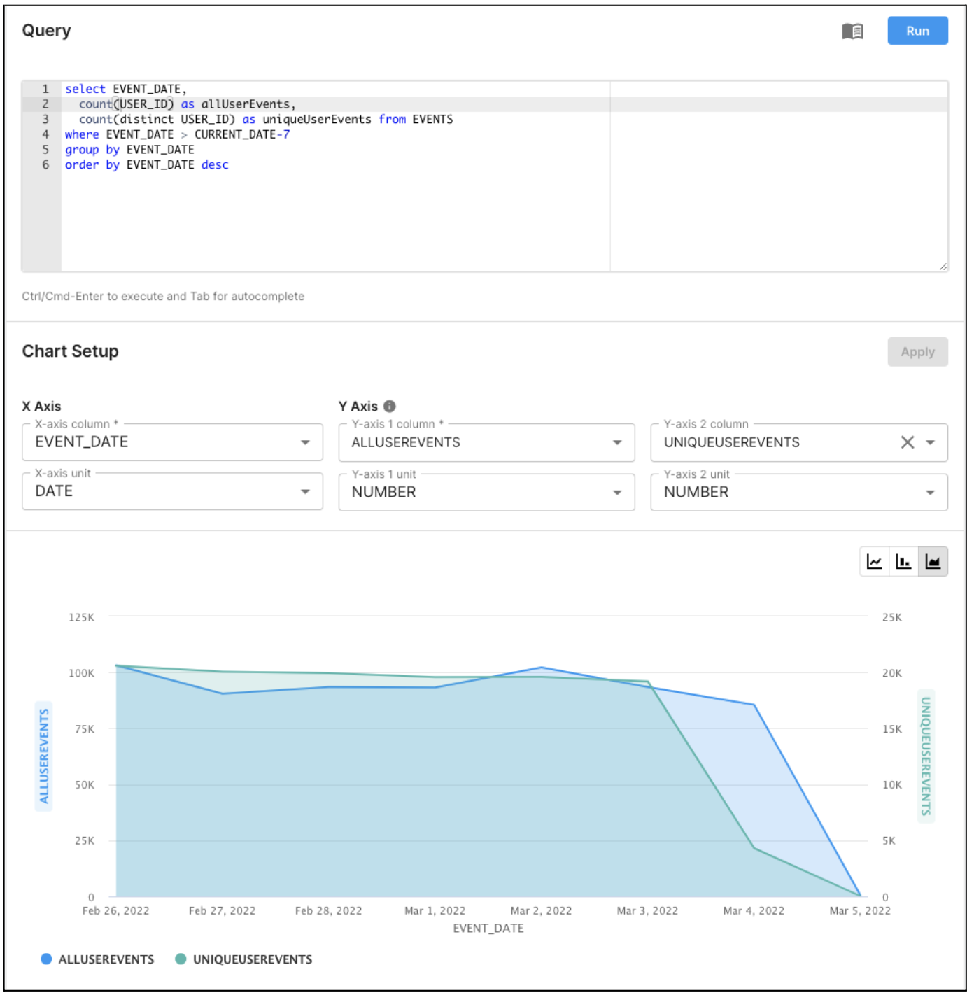 运行查询后,应设置图表。目前支持两个 Y 轴和一个 X 轴。为每个轴选择所需的列和单位。要重命名轴的标签,请在 SQL 查询中使用 as 表达式,这将重新标记轴的名称。