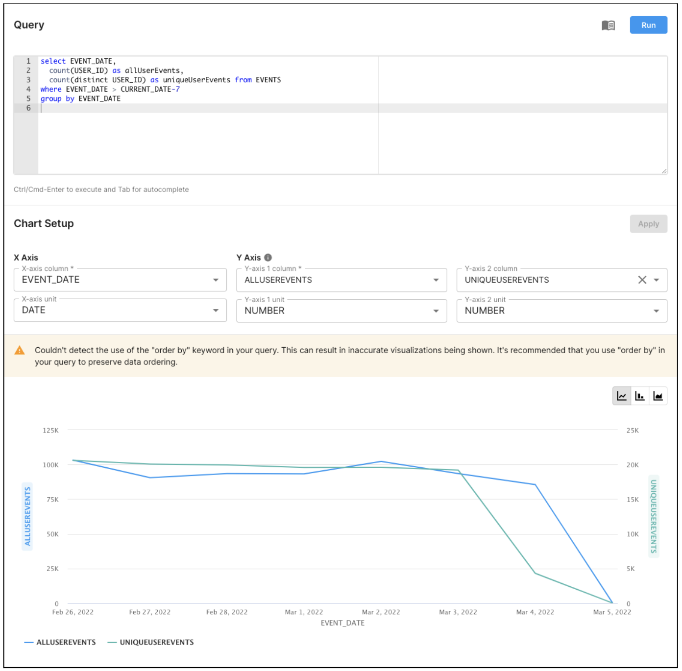 如果运行查询时未指定任何数据排序,则图表可能由于未排序而无法准确表示数据。这种情况下将显示一条警告,建议使用“order by”(排序依据)关键字对查询进行排序。