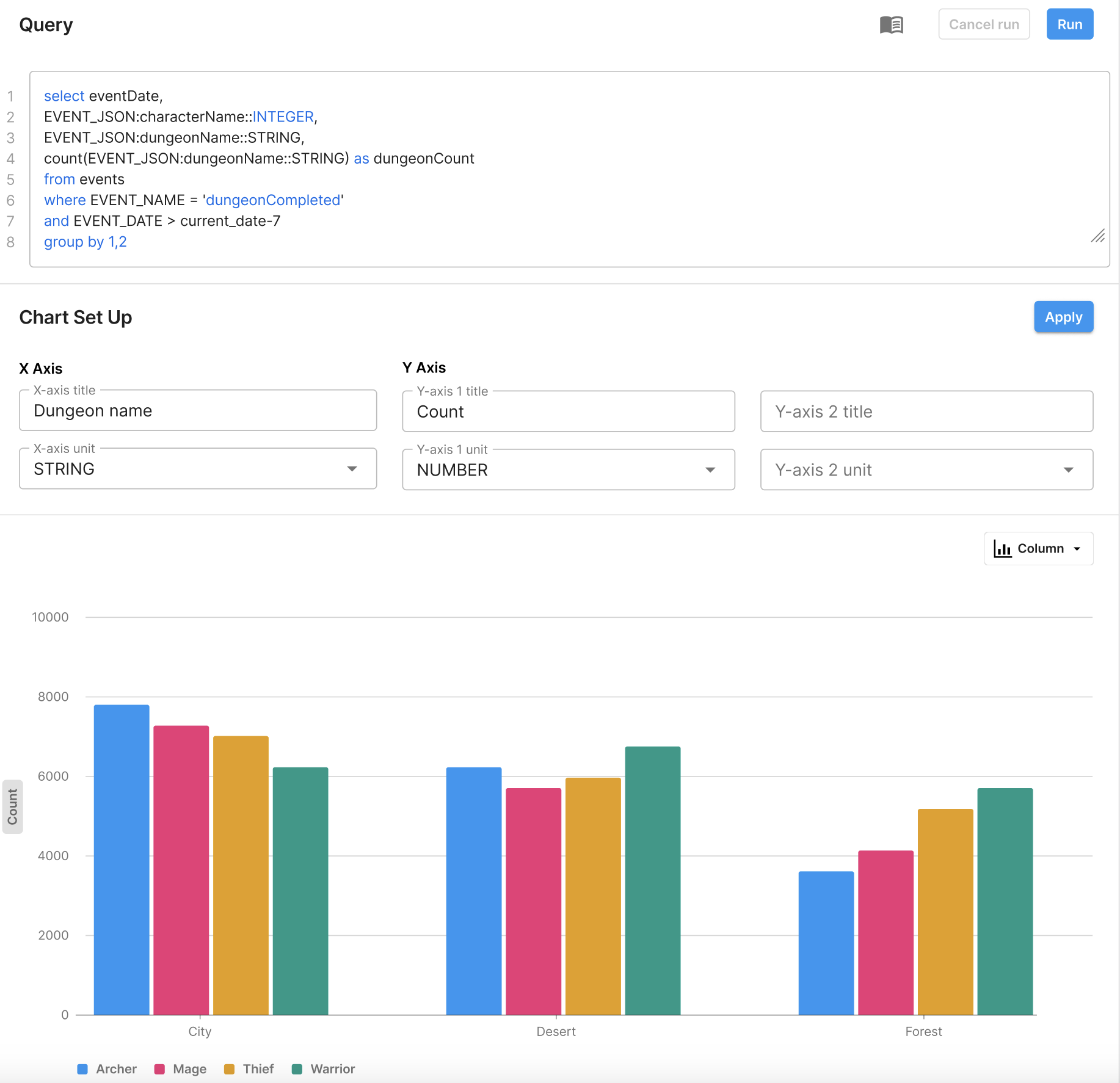 SELECT EVENT_JSON:missionID::INTEGER AS missionID , count(distinct case when event_name = 'missionStarted' then user_id else null end) AS starts , round( (count(distinct case when event_name = 'missionFailed' then user_id else null end) / starts)*100 ) AS "Players failed %" FROM EVENTS WHERE missionID <=10 -- Focus on the first few levels AND event_name in ('missionStarted','missionFailed') AND event_date>current_date-30 -- Use a date filter for efficiency GROUP BY missionID ORDER BY missionID