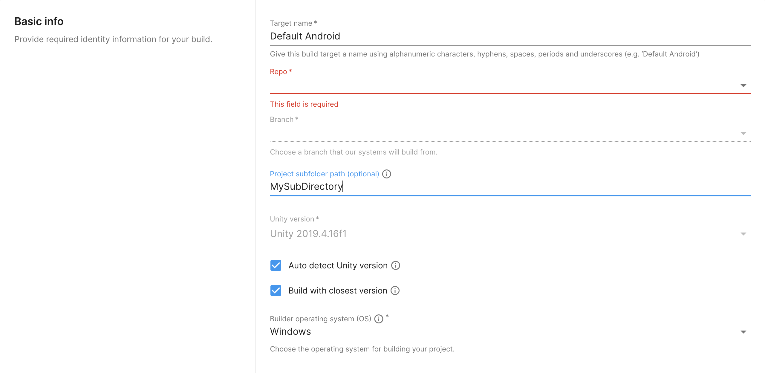 如果您的项目是 Unity 项目,但位于子目录中,则可以创建新的目标,并定义项目子目录路径的名称。这会告知 Unity Build Automation 在该子目录中查找需要构建的项目。 要在 Unity Dashboard 中更改目标,请执行以下操作:- 选择 Build Automation > Configurations(配置)。