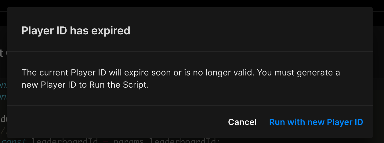 如果经过身份验证的游戏客户端调用 Cloud Code 脚本,这意味着玩家执行了触发游戏客户端执行特定脚本的操作。要对此进行模拟,请使用 Cloud Code 编辑器生成匿名玩家 ID 和访问令牌,然后在运行时公开给脚本。玩家 ID 是针对当前选定环境生成的,不存在于项目的任何其他环境中。 这些匿名玩家访问令牌的有效期为一小时,您可以在 Run Code(运行代码)选项卡的 Player ID(玩家 ID)部分中选择 Generate(生成) 来生成新令牌。