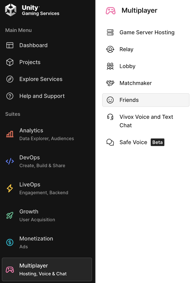 - 如果您还没有添加付款信息,Unity Dashboard(Unity 后台)可能会提示您添加付款信息。Friends 是一项带免费套餐的按量付费服务。不过,Friends 在 Beta 发行版本期间是免费的。