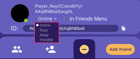您可以选择当前状态下拉菜单右侧的文本来设置您的活动状态。例如,您可以根据玩家当前在玩游戏中的活动设置自定义状态。- 选择 **In Friends Menu(在好友菜单中)**文本。这是默认的活动状态