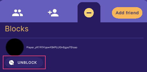 您可以查看您的屏蔽列表,然后选择玩家名称旁边的 **Unblock(取消屏蔽)**按钮,从而取消屏蔽相应玩家。