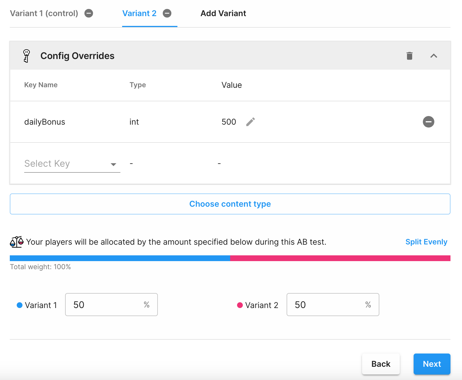 在 Content(内容)页面上,从 Variant 1(变体 1)下方选择 Add Keys(添加键)。选择 Key name(键名称) 和 Value(值)。变体 1 是控制组,并将与配置的默认值保持一致。使用顶部的选项卡添加新的变体组并重复上述相同步骤,但选择要测试的不同值。选择 Add a variant group(添加变体组) 来添加另一个变体。目前支持两种变体。最好一次测试一项变化,以了解您正在测试的变量是否影响您的各项指标。 默认情况下,您的玩家会均匀分配至控制组和变体组。如果您想要控制某个组的个别权重,请选择 Split Manually(手动拆分)。我们建议将变体拆分到您感到舒适的水平。