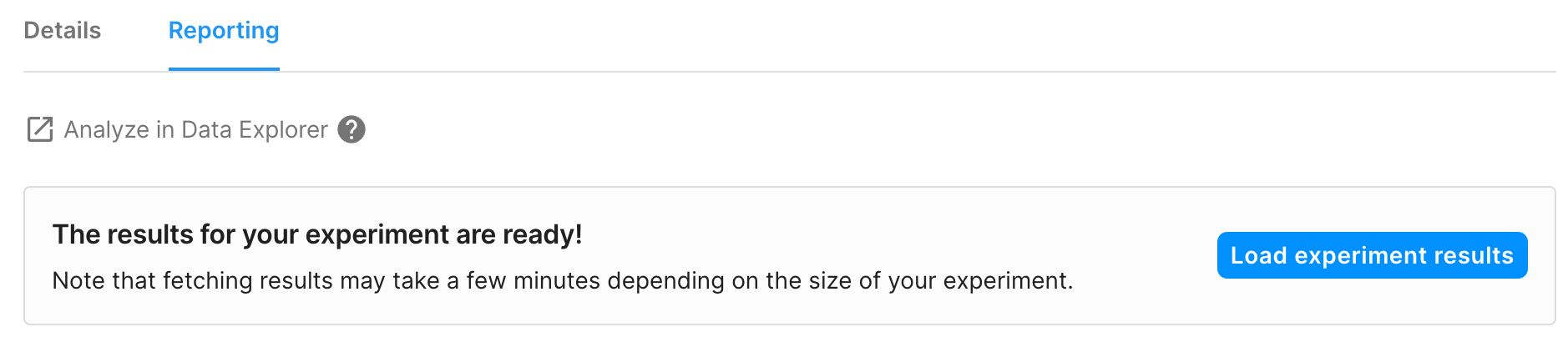 在 A/B 测试运行了 7 天并且达到了所需的参与人数后,您可以从 Reporting(报告)选项卡中选择 Load experiment results(加载实验结果)。