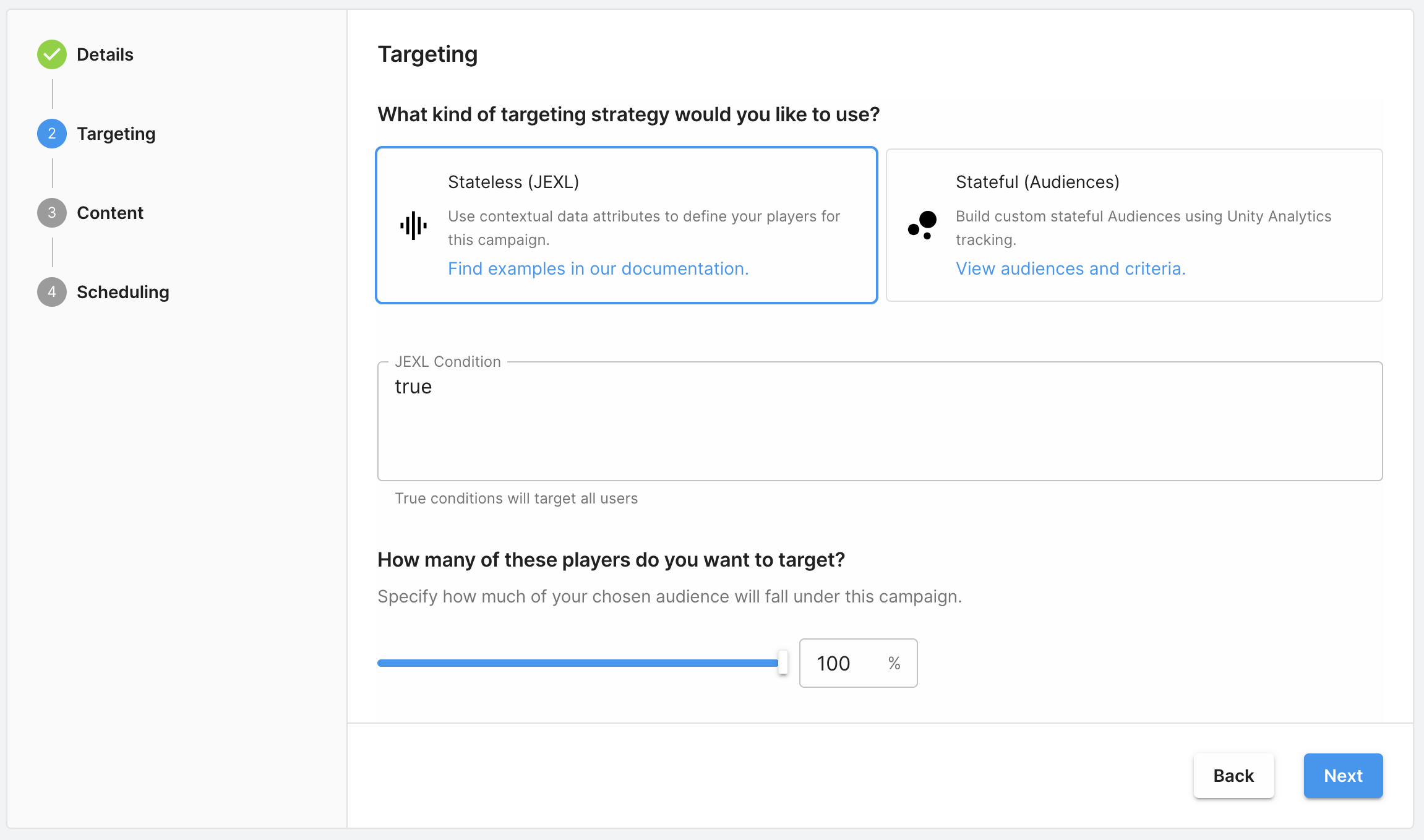 选择定向投放方法来选择目标受众:JEXL(无状态)或 Audiences(受众)(有状态)。如果您想要针对所有玩家投放覆盖,请在这些选项下方的条件字段中选择 True。