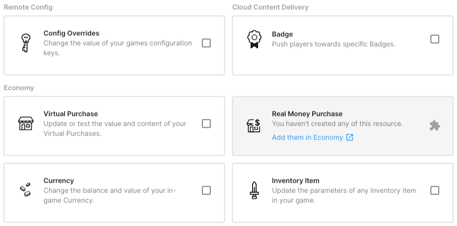 Game Overrides 可以控制 Remote Config 键、Cloud Content Delivery (CCD) 和各种 Economy 资源。可以通过以上内容直接从 Dashboard(后台)对游戏中的各个组件进行更改。
