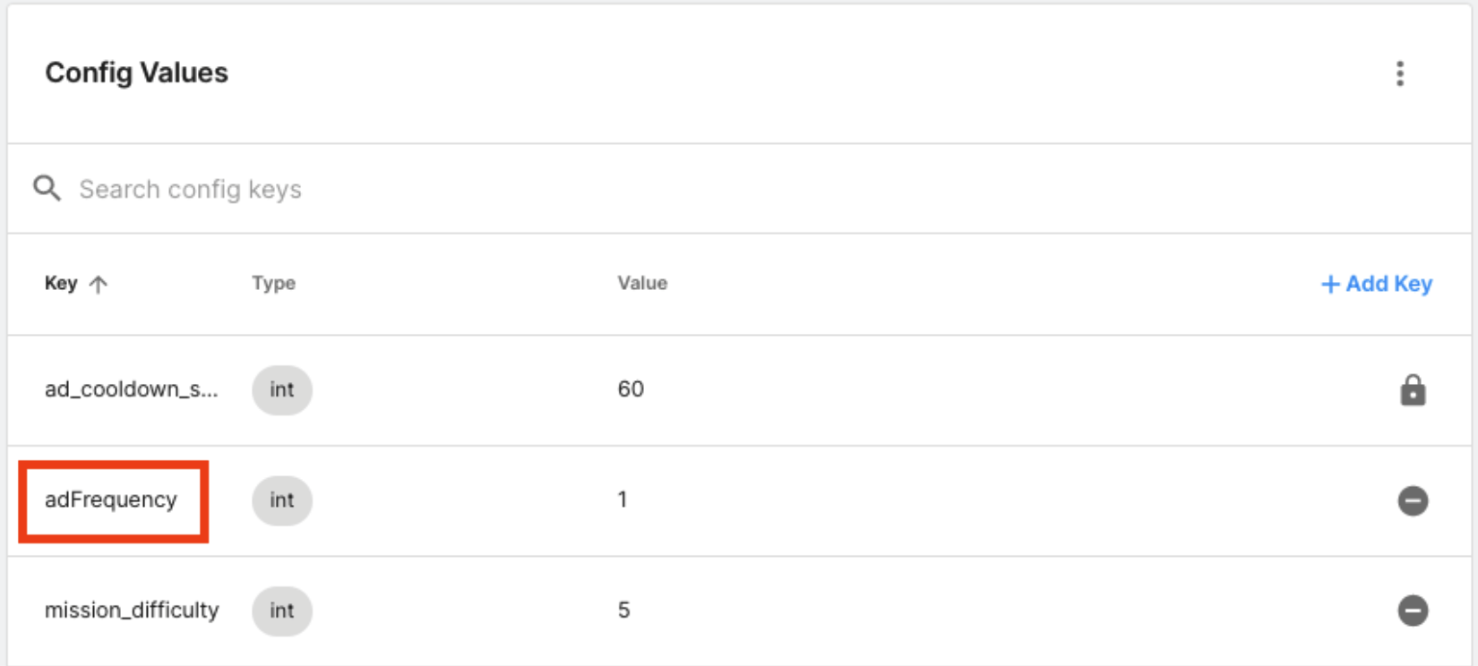 设置 Remote Config 键有两种方式:通过后台或通过编辑器。 在 Unity Dashboard(Unity 后台)中,转到 Remote Config 的 Config(配置) 页面。您可以在侧边栏中的 LiveOps 下方找到该键。 要添加将面向重度玩家更改的配置键,请执行以下操作:- 单击 Add Key(添加键)。