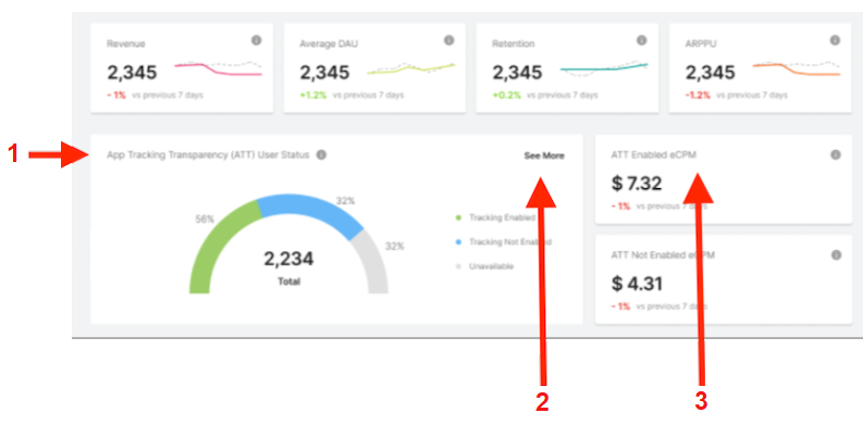 ATT 报告按照不同 ATT 状态,显示比较过去 7 天所有项目中 iOS 14 及更高版本的用户指标变化。使用左侧的下拉菜单可按不同指标(收入、eCPM 或展示量)筛选数据。使用右侧的下拉菜单可筛选项目。