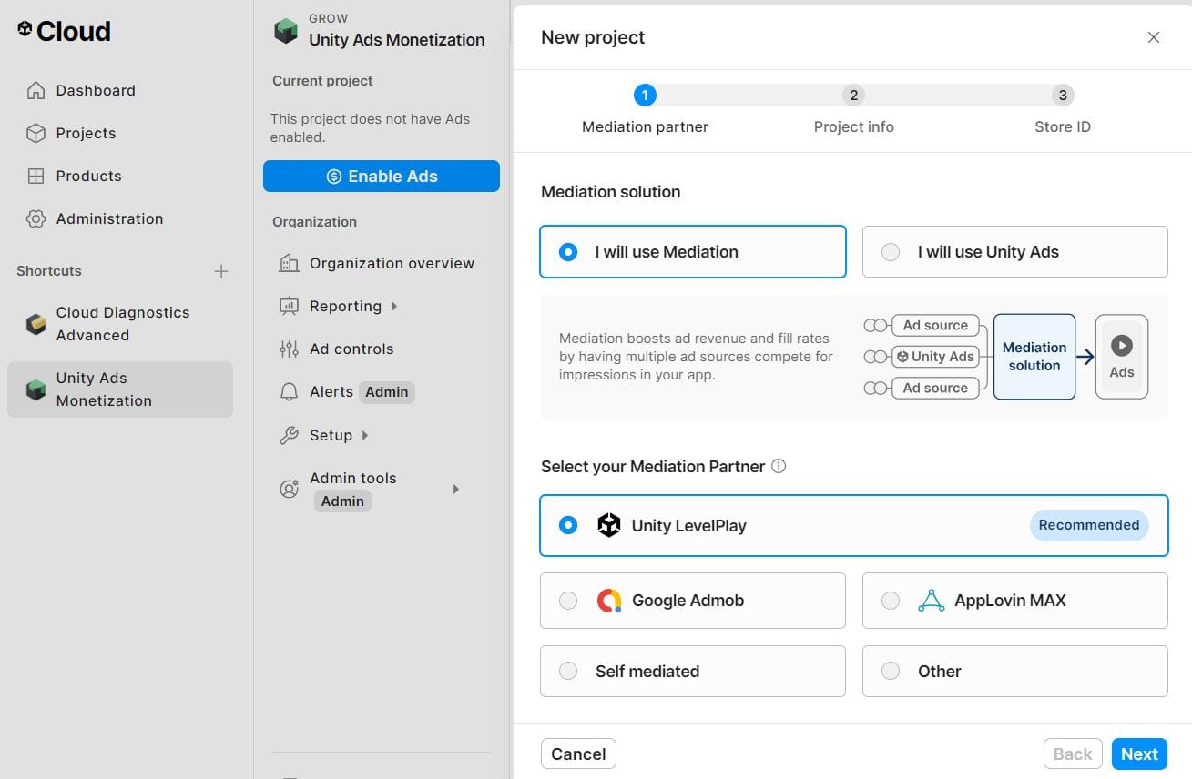 完成应用开发并创建 Unity Cloud 项目后,即可通过 Unity Ads Monetization(变现)后台使应用变现,开始获得收入。 选择 **Enable Ads(启用广告)**将打开用于设置聚合解决方案的工作流程。如果要为应用使用聚合功能,请选择聚合合作伙伴,并提供必要的项目信息和 Store ID。如果不使用聚合,而仅使用 Unity Ads,只需输入您的项目信息和 Store ID。 完成以下步骤,在 Monetization(变现)后台中设置 Unity Ads 项目: