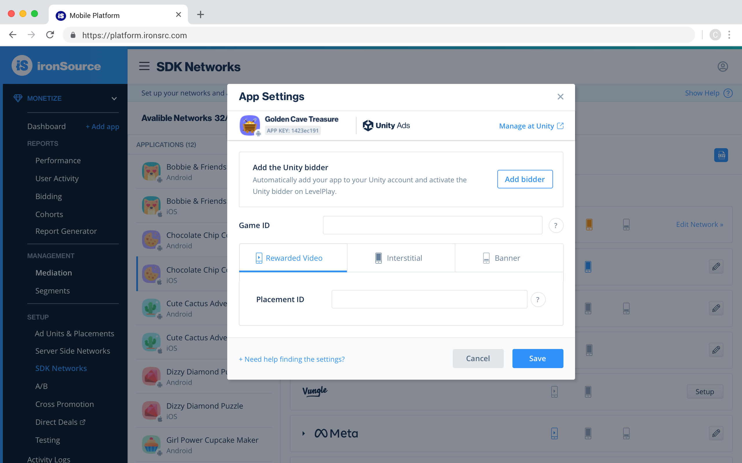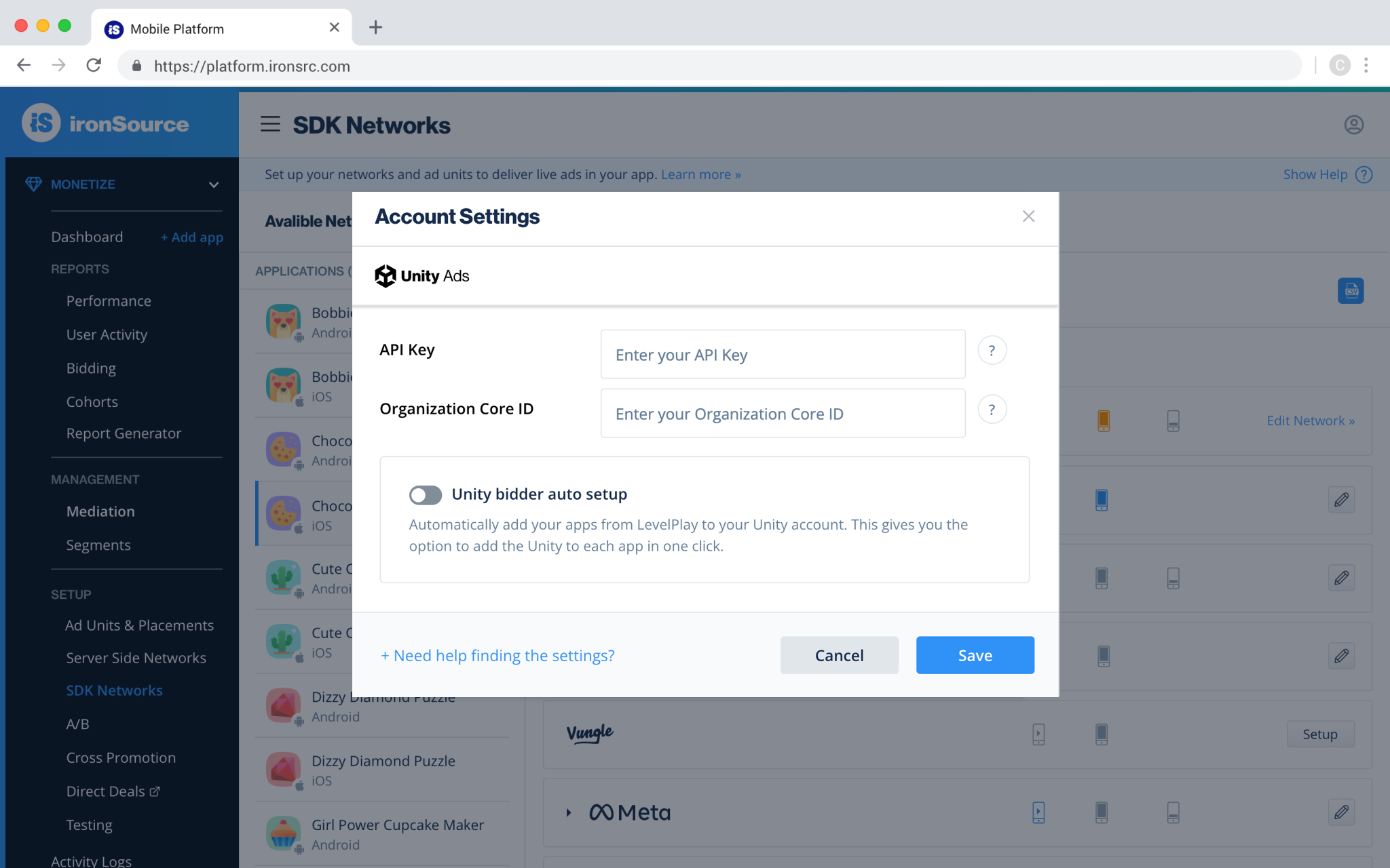 For the Unity Ads network, the auto-setup tool is available to use after you complete step 1 below. The auto-setup tool will create an app and bidder placement and retrieve placement details from Unity Ads—so you don’t need to switch between the LevelPlay and Unity Ads platforms. Alternatively, you can complete the whole setup manually.