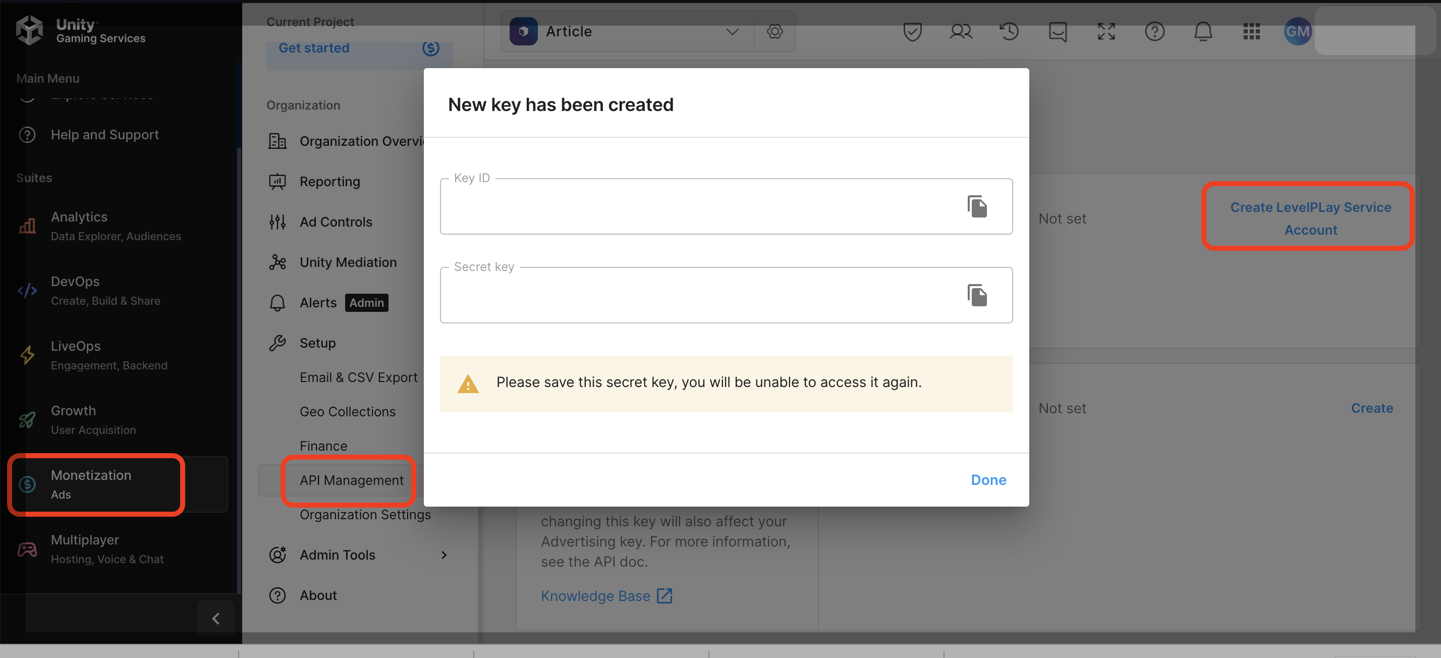 You’ll need to retrieve the following details from the Unity Ads platform to complete setup on LevelPlay:- API Key