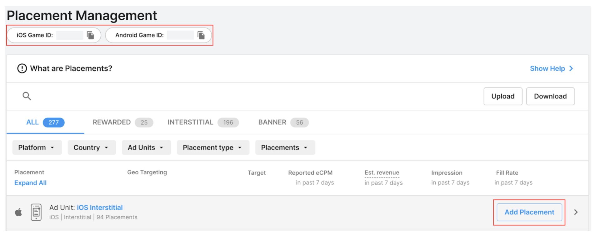 After your project is created, navigate to Monetization > Placements and take note of the Game ID for both platforms.