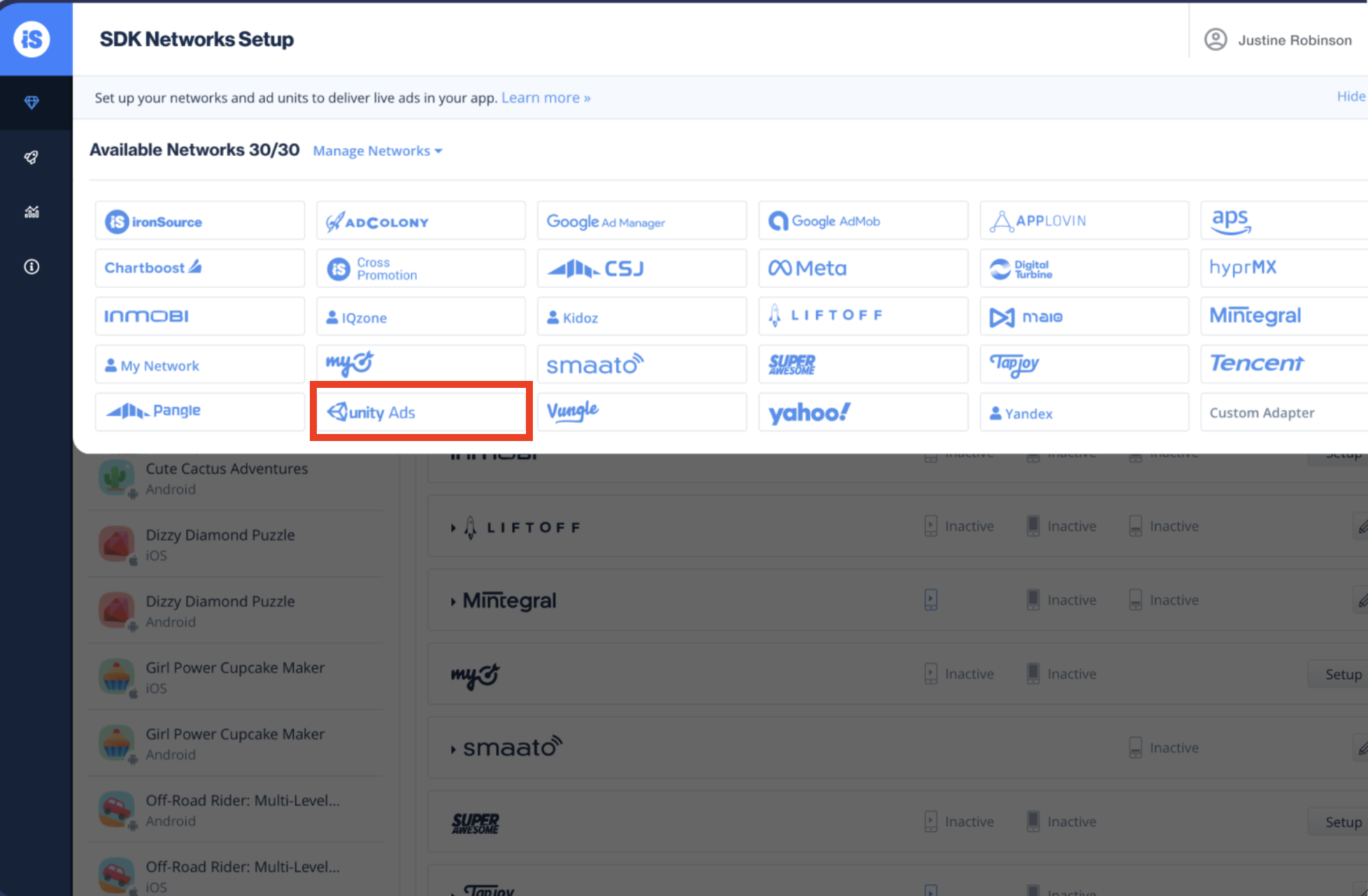- Choose the app you want to integrate from the list on the left side of the SDK Networks page