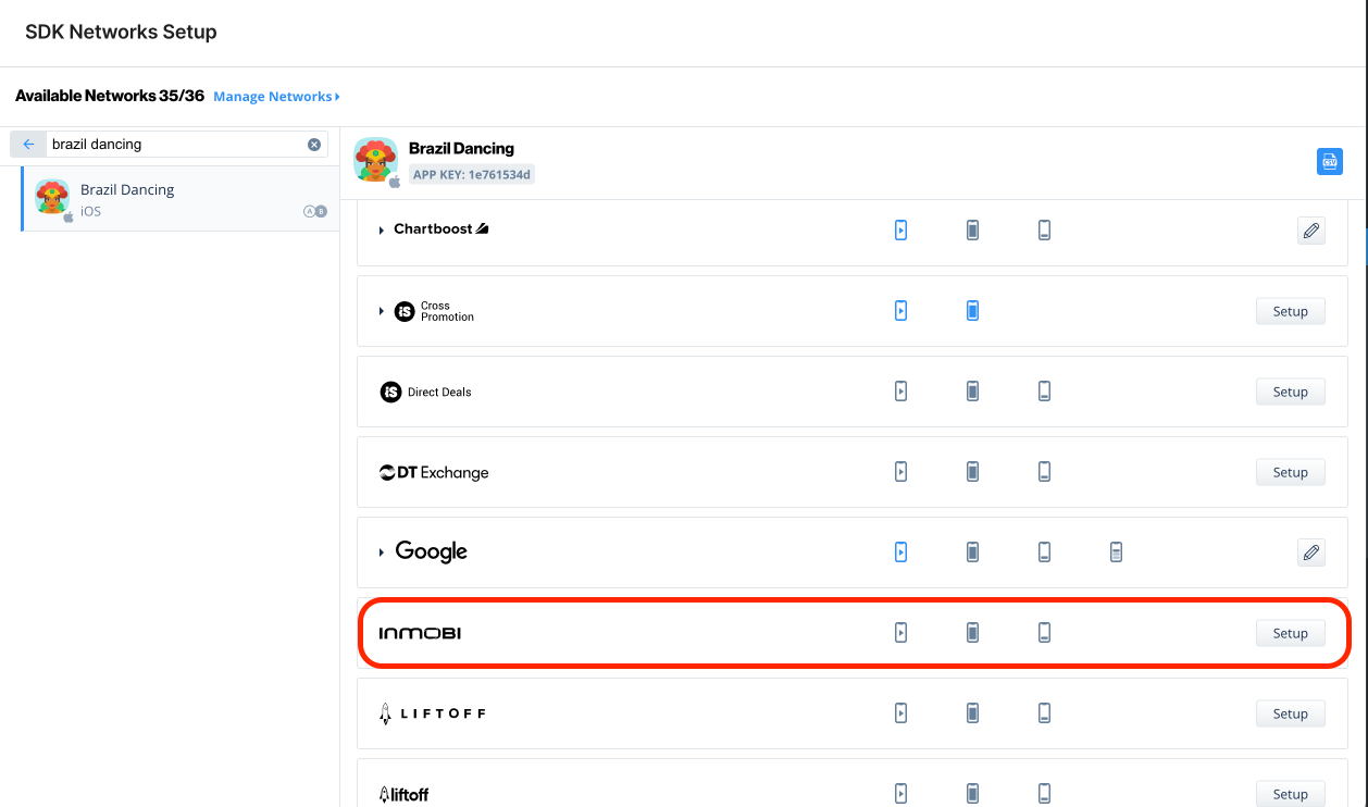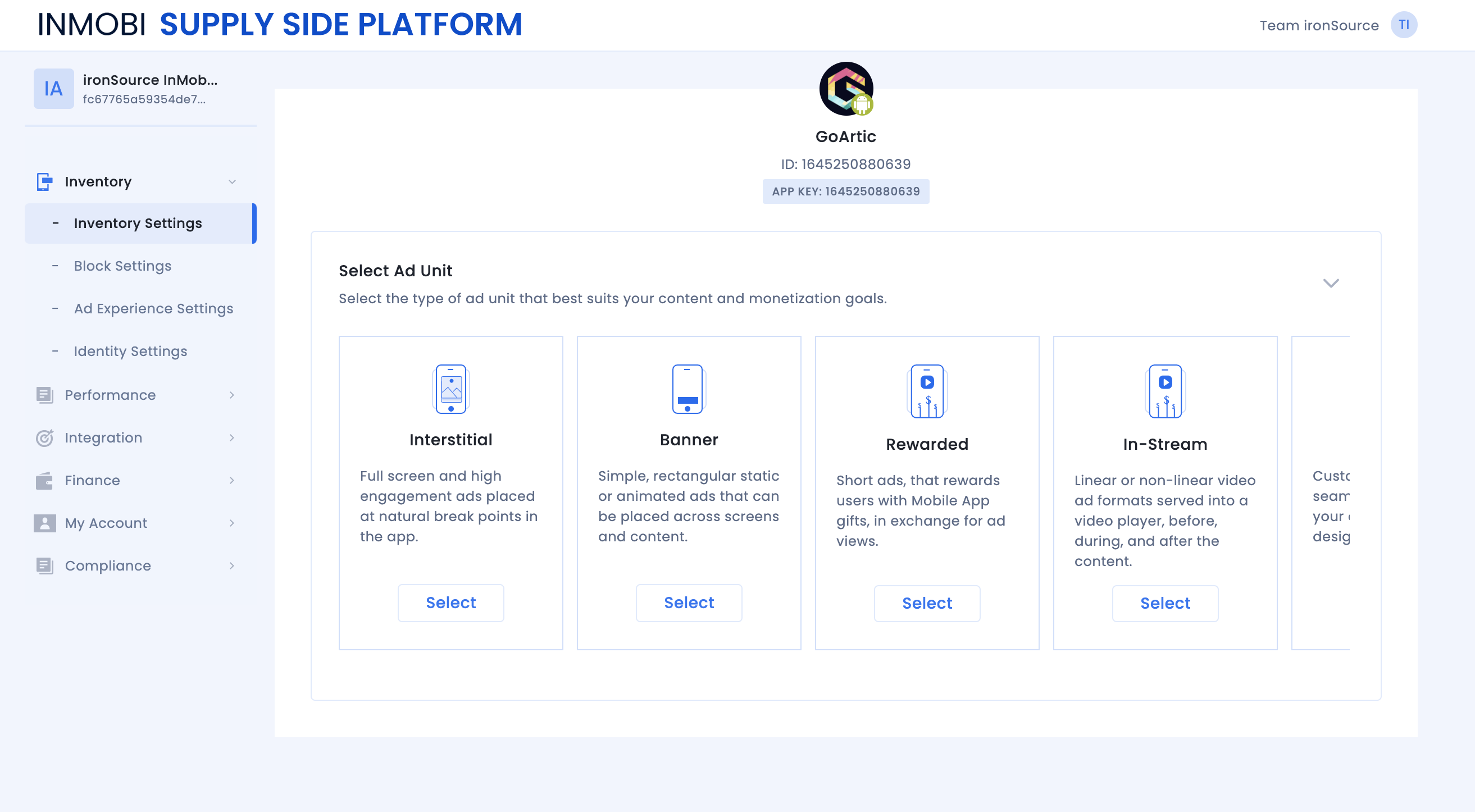 - Select the app on which you’d like to run Unity LevelPlay Mediation with InMobi.
