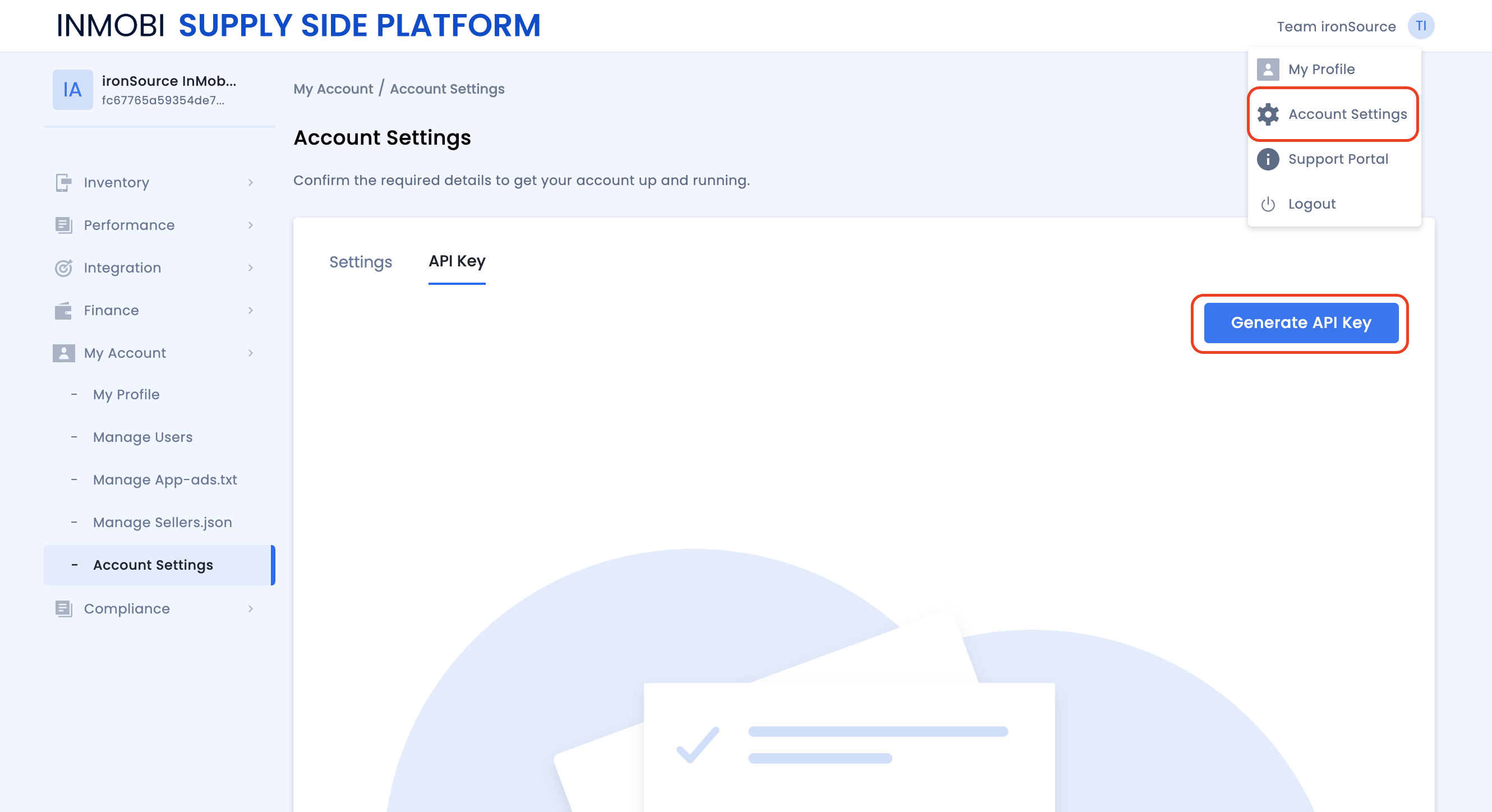 This is the unique identifier for your InMobi account. To locate this parameter, click on the name icon in the top laft-hand corner of your admin panel. You will then see your Account ID listed:
