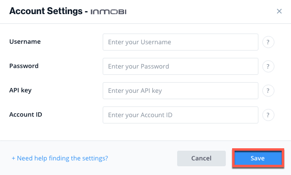 - Enter your InMobi Username , Password , API Key and Account ID in the relevant fields.