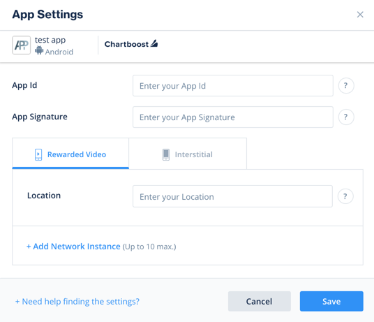 - Enter the Chartboost App ID, App Signature, and location User ID in the relevant fields.