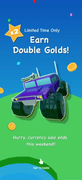 通过提供更高价值的奖励,您可以更大力度激励用户与 Offerwall 交互以及完成 Offerwall 任务。因此,还会进一步提高用户参与度和任务完成率,从而实现广告收入提升和 IAP 增长(因为用户在获得奖励并体验到游戏增益效果后更愿意付费)。 此外,当您告知客户经理您正在规划货币促销时,此信息将与 Offerwall 广告主共享,鼓励他们为您的流量提供更高出价。 请点击此处,阅读世界高尔夫巡回赛 (World Golf Tour) 如何通过 Tapjoy 货币促销将收入提高 149%。货币促销类型 | 描述 |