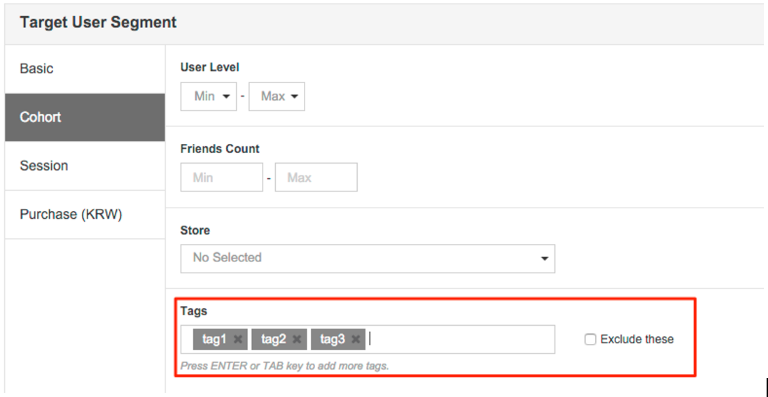 将 Tapjoy 内容定向投放到用户细分段时,可根据用户的标签来包含或排除用户。为此需要执行以下操作:- “Tags(标签)”定向投放位于“Target User Segment(用户细分段定向投放)”框中,在创建/编辑内容屏幕的“Cohort(群组)”选项卡下。