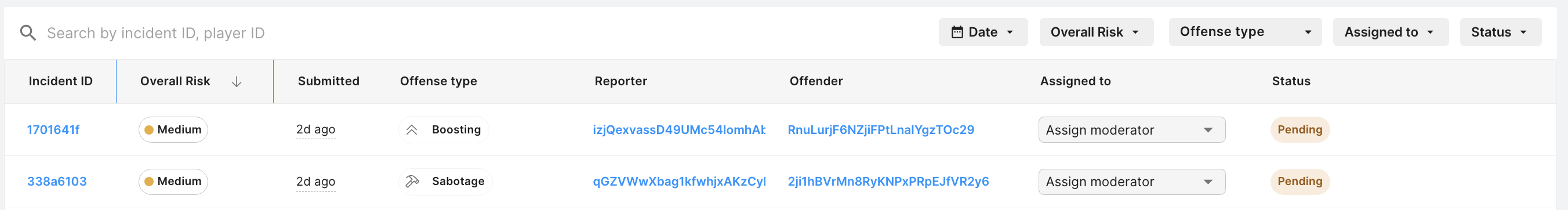 Search and filter moderation incidents by player, date, status, or severity.