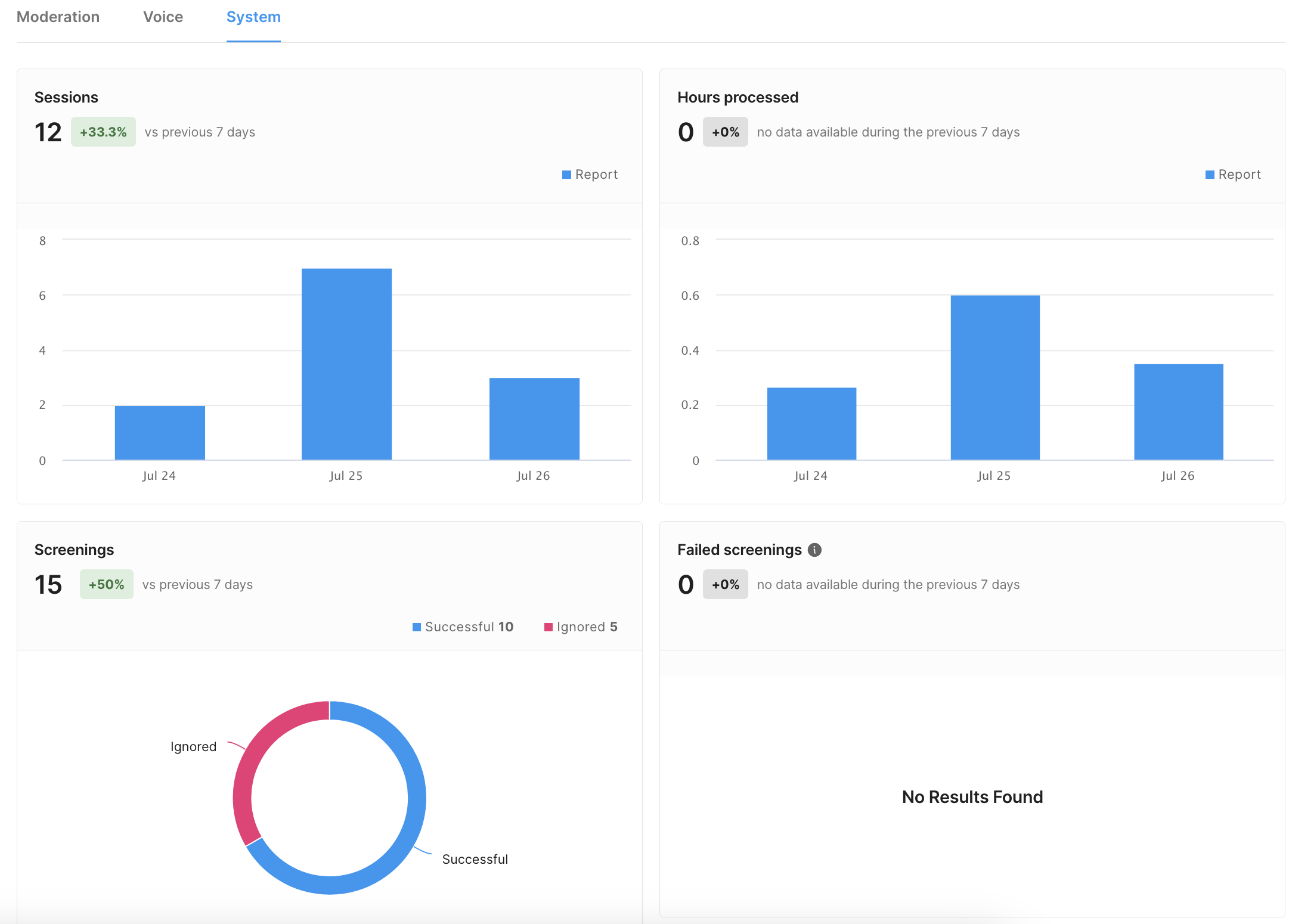 在 Overview(概览)后台页面上,用户可以检查与 Moderation(审核)、Voice(语音)以及 System(系统)相关的指标。Moderation(审核)