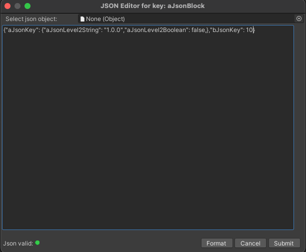如果您使用的是 JSON 类型的设置,则 Remote Config 窗口会显示 **JSON Editor(JSON 编辑器)**对话框。您可以使用该对话框调整 JSON 值的格式并进行验证。要打开此窗口,请单击 JSON 设置所对应的 **Edit(编辑)**按钮: