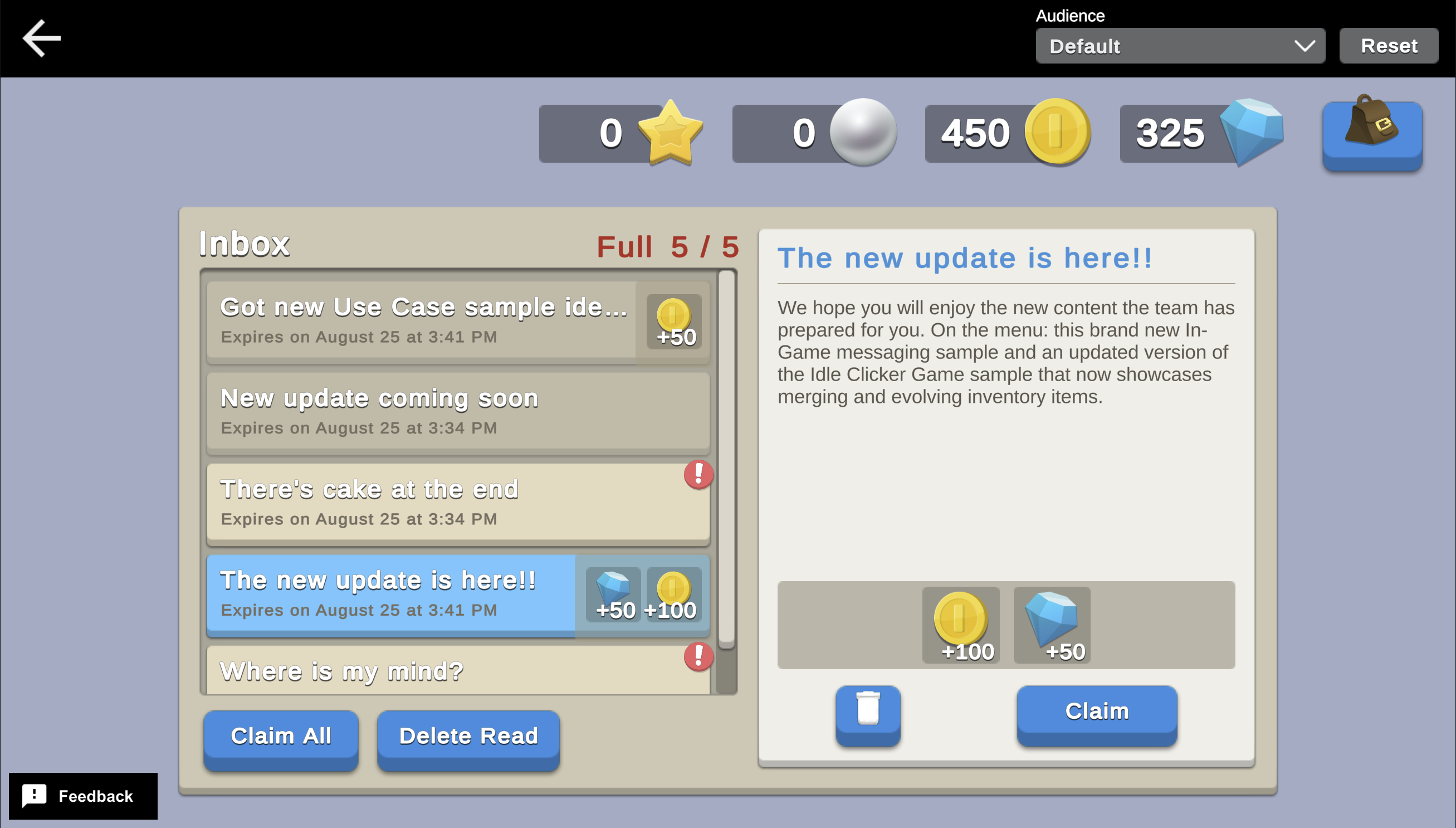 When a player loads the scene for the first time, they see an inbox with a list of messages waiting for them to read. On subsequent loads, the inbox is either in the state they left it, or an updated state due to messages expiring between sessions. Players can interact with the messages, claim their attachments, delete messages, or reset the inbox to a brand new state. To see this use case in action:- In the Unity Editor Project window, select Assets > Use Case Samples > In-Game Mailbox, and then double-click to open the sample scene.