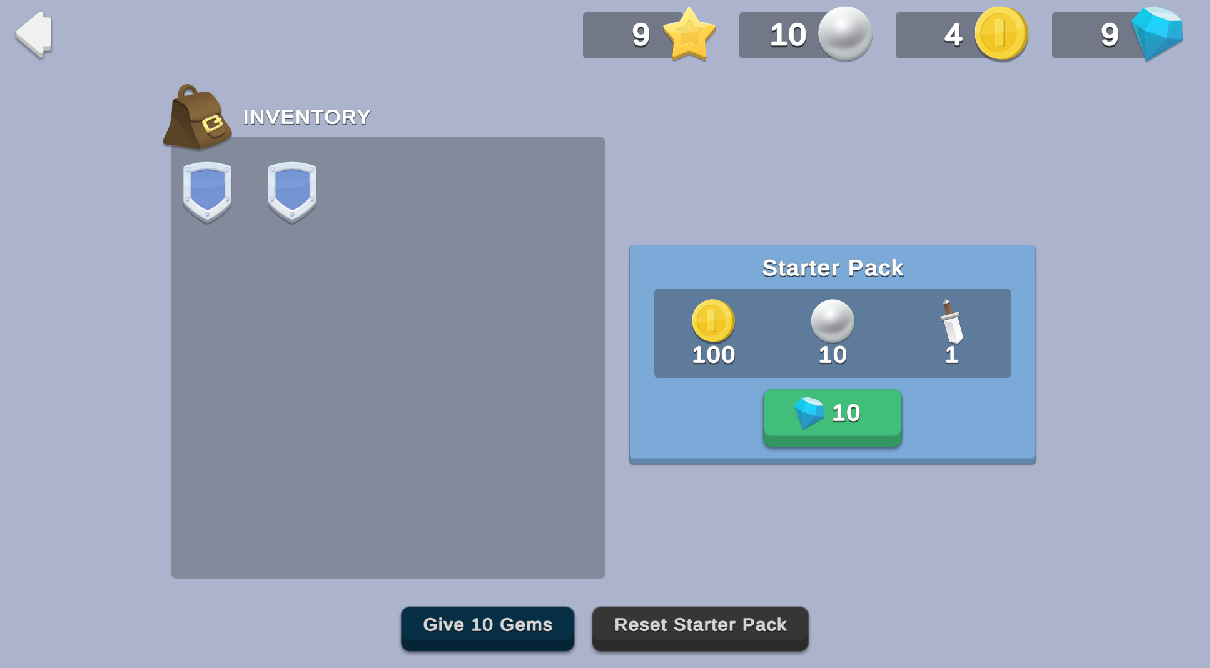 In this example, the starter pack costs 10 Gems. For demonstration purposes, this scene provides a button that grants the player 10 Gems each time it is clicked, which ensures enough currency to test the purchase. When you click the Give 10 Gems button, the following occurs:- The button's method calls the